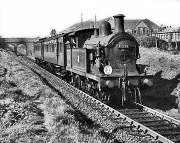 Photo copyright Ron Strutt ![]() Sometime in the mid 1950s Class H No.31239, having left Chevening Halt just a minute or so previously, slows on the approach to Dunton Green with one of the ex-steam rail-motor sets. The curve into the station commences just behind and to the right of the photographer. Towards the top right Dunton Green Primary School can be seen and, above the train, the industrial buildings which once stood on the west side of London Road. The train has passed beneath London Road bridge, left background, which today is partially infilled with one arch remaining open as a footpath subway provided for the benefit of the school. The footpath is, however, at a somewhat higher level than the former railway track reflecting the infilling of the cutting. This is one of the very few known photographs showing the railway when still in use at London Road.