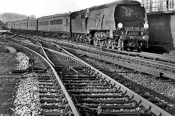Photo copyright Ron Strutt ![]() An un-rebuilt Bulleid Pacific approaches Dunton Green with a London Bridge to Tonbridge service on an unknown date in the 1950s. Dunton Green signal box can be seen on the right, with the Westerham branch and its trap siding in the foreground. Note the conductor rails on the main lines are protected with wooden boarding; this is a common sight in areas where staff may need access to track in the course of their duties. Unfortunately, the image is too small and of too poor a quality to enable positive identification of the locomotive. However, it appears to be one of the Battle of Britain class with nameplates fitted lower down to enable attachment of the arrow adornment when operating the 'Golden Arrow' named train. The headcode discs suggest that the train is a London Bridge to Tonbridge service. The stock comprises a motley collection of BR MkI, Bulleid and Maunsell vehicles with at least one of the latter being to the narrower Hastings gauge. The Bulleid Pacifics came in three classes; the heavier Merchant Navy and the lightweight West Country and Battle of Britain 'go anywhere' versions. Their history, technical and general, is too complex for inclusion in an image caption but can be read on several internet sites including Wikipedia. Several members of all versions have survived into preservation. A brief description of the Golden Arrow can be read here and a Britannia Pacific can be seen leaving Victoria with the arrow adornment fixed to its smoke deflector on the same page.