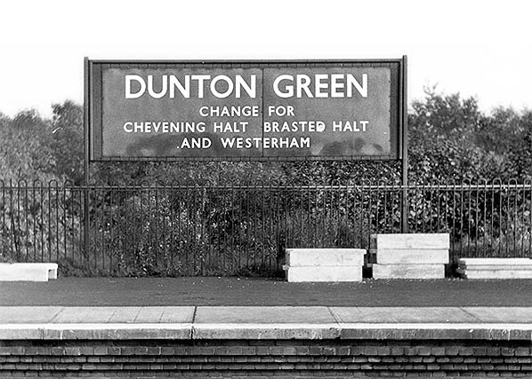 ![]() One of Dunton Green's BR running-in boards photographed subsequent to Brasted becoming an unstaffed halt in 1955. Compare this with the earlier view showing a running-in board without 'Halt' suffixed to Brasted. One may wonder if the expense of a new board to reflect Brasted's downgraded status was justfified but a name is a name and 'Brasted Halt' appeared on the halt itself, in timetables, on tickets and so forth so it was sensible and avoiding of any possible confusion to update the information at Dunton Green accordingly. Information such as that above was once a common sight across the railway network and in some cases was much more elaborate, but the practice largely died out with the introduction of BR's black and white signage which appeared from the late 1960s. Passengers on the ostensibly privatised rail network of today are to a large degree expected to know where to change trains if necessary although the information is given when buying tickets online. But despite such information on station signage being now all-but history, it has been found necessary to introduce the rather patronising practice of adding 'London' to the name of every terminal in that city. Thankfully, however, we have been spared the insult of 'London London Bridge'. Back at Dunton Green, clear in the above view is the construction of these enamel boards in two sections. This was normal practice for boards displaying anything but the shorter station names.