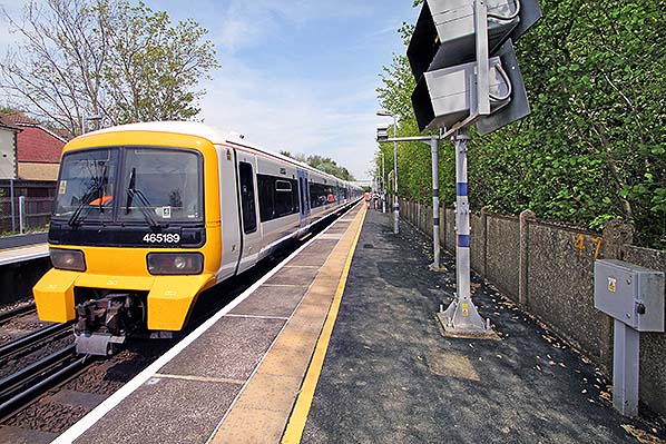 British Rail Class 465 Networker EMU 465189 has just arrived at Dunton Green station in April 2014