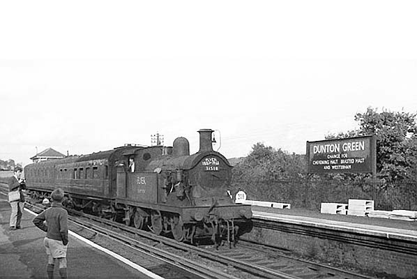 Dunton Green Station Gallery 4: Last Day - April 1974 ![]() Dunton Green branch platform on the final day of the Westerham branch service, 28 October 1961, with Class H No.31518 and Maunsell set 610 about to operate the 11:50 service to Westerham. This train was to make two further trips on the branch before being replaced by the main line set. Just beyond the rear of the train the new, but not yet commissioned, colour-light signal can be made out. It bears an X-shaped device to tell drivers and guards that it is not in use. The year 1961 saw not only the end of the Westerham branch but also the introduction of electric trains beyond Sevenoaks to the Kent coast.