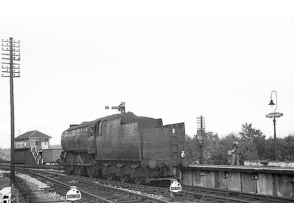 Photo by Chris-Knowles-Thomas from Southern E Group web site ![]() The Bulleid Q1 No.33029 is seen here in the branch platform at Dunton Green. The tail lamp and the direction the driver is facing suggest that the Q1 has just arrived from Tonbridge and is reversing onto the branch. On the right a BR totem can be seen and, foreground, two of the Southern style ground shunt signals which had been supplied by Westinghouse. The Q1 will probably pass through the branch platform and perform another reversal onto the loop where it will await the arrival of the train from Westerham. One may wonder why the Q1 did not simply enter the loop, visible on the left, direct from the main line. The answer appears to be that although such a move was possible in theory, the signalling did not permit it.