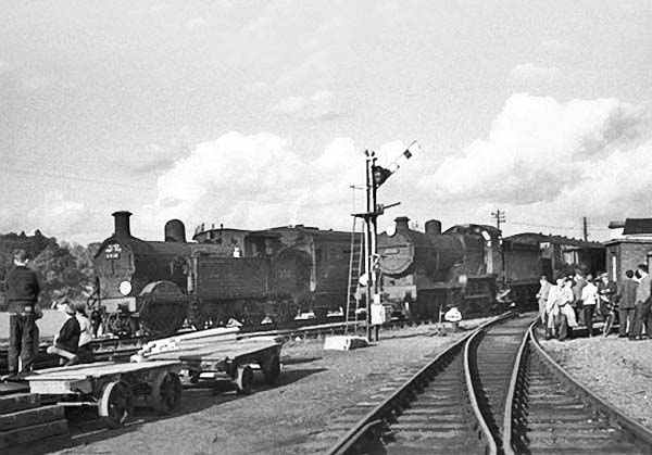 Photo by David Pearson ![]() On the final day of the Westerham branch service, 28 October 1961, Class D1 4-4-0 No.31739 prepares to depart Dunton Green with the 2.50pm service to Westerham as the push-and-pull train it replaced waits on the loop. Following departure of the D1, the push-and-pull train with Class H No.31518 will proceed to the main line and return to Tonbridge. On this occasion it is good to note that most enthusiasts are standing behind the sidings on the right and thus well clear of the running line. The branch area at Dunton Green had become, photographs suggest, something of a base for the permanent way department during the period when the main line was being resignalled and electrification was undergoing extension beyond Sevenoaks. On the left are two of the lightweight trolleys used by the PW men. They are standing not on track but on the ground, a common practice. They were designed to be lifted on and off the tracks manually; a task easily undertaken by a couple of reasonably fit men. These trolleys would be pushed manually along the tracks at the work site or, sometimes, coupled to a petrol trolley such as those manufactured by D Wickham & Co. The trolley nearest the camera has larger wheels and appears to be of a somewhat older design than the other.