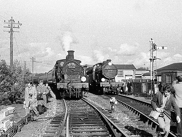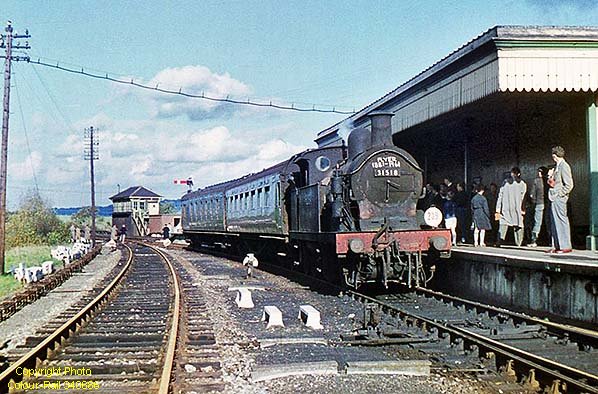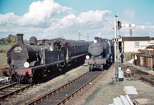 Photo by John Cramp from 30937 Transport Photograph Database Flickr photostream ![]() On the final day of service on the Westerham branch, 28 October 1961, Class H No.31518 and Maunsell set 610 waits in the loop opposite the branch platform at Dunton Green as the D1 No.31739 and shortened main line set 277 takes over the branch service. The push-and-pull train will have disgorged its passengers at the platform before reversing and shunting into the loop. Following departure of the D1 and train it would have proceeded off the branch and returned to Tonbridge. The reason for this procedure would have been the rear coaches of the 7-car main line set (reduced from 10-car for the occasion) fouling the points at the north end of the loop. The Union Flag which had adorned the front of No.31518 was presumably removed as soon as the train arrived at Dunton Green but the bunting which also adorned the locomotive is thought to have dropped off along the way if the sequence of photographs is anything to go by. Ahead of the camera can be seen the Southern style branch down starting signal; this was the last of several signals which had stood at this spot throughout the life of the Westerham branch. On the far right the track leading into the goods yard is seen. This 'yard' comprised just three dead-end sidings and as such was rather a poor excuse for a goods yard. What facilities existed were somewhat remote from the sidings; the wooden building seen on the right, for example, was the goods shed. Dunton Green stationmaster's house stood just beyond the end of the sidings and adjacent to the west side of the station approach road.