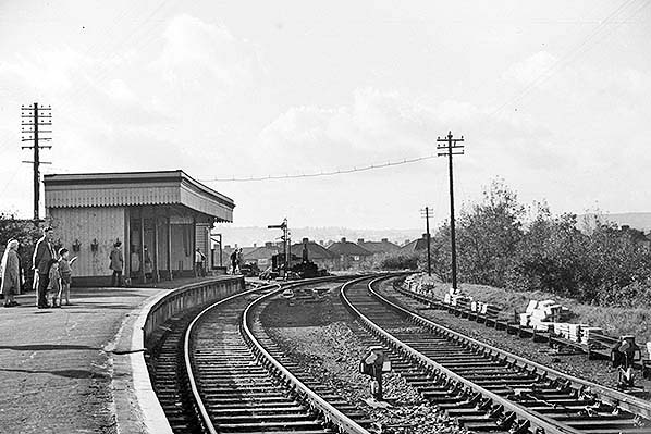 Photo by Ian Nolan from his Flickr photostream ![]() Dunton Green branch platform on the final day of the Westerham branch service, 28 October 1961. Train-less views such as this offer a chance to see other details such as the fire buckets hanging on the end of the shelter and, just inside the goods sidings, the loading gauge which has been moved from its previous, conspicuous position. Being a Saturday a number of children are present at all stations and halts on the branch including the boy seen on the left. Perhaps he is with his parents or grandparents who have brought him along to witness the last day of the Westerham branch. The housing estate in the background was built just prior to WWII. No doubt the residents used Dunton Green station to reach London and other places but few probably had any need to use the Westerham branch.