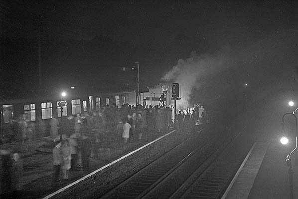 Photo by Chris-Knowles-Thomas from Southern E Group web site ![]() An atmospheric night time view of a gas-lit Dunton Green station on 28 October 1961. The train is the 8.19pm arrival. Under normal circumstances the final branch passenger train of the day would be the 7.50pm from Dunton Green, with the locomotive returning to Dunton Green with the branch goods. However, on the final day the use of the main line train dictated that it return complete to Dunton Green. This it did, in service. Note that the locomotive is beyond the up branch to up main starting signal. This is an example of when a train would be signalled away from a station by the Advanced Starting signal and it is possibly this signal which can be seen in the right background although the light which is visible does appear to be rather too close to the station, the relevant signal at Dunton Green being located 330yd from the signal box. Once the train had left the branch and a locomotive sent down the line to collect wagons, the end had come for the Westerham branch - with the exception of the Railmobile. This view is useful because it tells us that coaching stock set 277 retained a brake at each end. It had been reduced from 10 to 7-car length for use on the branch so the reduction involved the removal of three intermediate vehicles, probably including the buffet and adjacent first plus one other. Set 277 comprised mainly Mk1 stock but is known to have included a Bulleid vehicle at various times. Visible above are the two semaphore starting signals, the taller one being for branch-to-main and the shorter being the up main starter. The colour-light signal, not yet in use, can also be seen. Two of the gas lamps visible are sporting BR totems. There are a number of people standing on the track adjacent to the platform ramp. One would hope that they are railway staff but if members of the public they are being extremely stupid, not least because they could trip in the darkness and fall onto the conductor rail just feet away from them.
