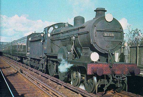 Copyright photo from Colour Rail 340068 ![]() Class D1 4-4-0 No.31729 and Waterloo - Weymouth set 277, reduced from 10-car to 7-car formation but still with a brake at each end, stands in Dunton Green's down main platform on 28 October 1961. This train would take over the Westerham branch service, the locomotive alternating with Bulleid Q1 No.33029, from Class H No.31518 and push-and-pull set 610 at 14:50. The train is in immaculate condition but the locomotive is rather grubby, as was the Bulleid Q1. This was rather unusual for BR as locomotives used on such irregular workings were generally smartened up. However, it should be remembered that this train was not a railtour but a normal service train and the two locomotives would have been rostered as such and probably at fairly short notice. The train will have originated in London, running as empty stock to Dunton Green (the headcode is that for the Tonbridge line) but the precise arrangements are unclear. The locomotive was allocated to Bricklayers Arms but the stock, being normally allocated to the Southern Region's South Western Division, had possibly come from Clapham Junction. Having arrived at Dunton Green to gain the Westerham branch the train would reverse, via the crossover at the north end of the station, onto the up main line and then draw forward onto the branch. This move would have been smartly performed under the control of shunt signals as the main line was busy with the half-hourly electric service to and from Sevenoaks, steam services to Tonbridge and beyond plus freight and parcels traffic. No.31739 and train would not have shunted onto the branch until the push-and-pull train had returned from Westerham and, having alighted its passengers, shunted onto the loop opposite the branch platform. Armed with this information, the above photograph would have been taken at around 14:20 - 14:25. The curtains were about to be drawn for No.31739 too, for she was withdrawn from service the following month.