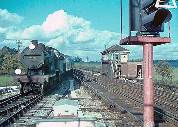 Photo from Jim Lake collection ![]() On the final day of the Westerham branch service, 28 October 1961, Class D1 No.31739 runs off the main line at Dunton Green onto the Westerham branch with main line set 277. The push-and-pull train, No.31518 and set 610, will have cleared the branch platform and will be waiting in the loop until the train seen above has departed with the 14:50 to Westerham. No.31739 and train ran to Dunton Green as empty stock but the headcode does not tell us where it originated and this is further complicated by set 277 normally working on the South Western Division's Waterloo - Weymouth services. Clutter can be seen above in connection with re-signalling ahead of the extension of electrification from Sevenoaks to Dover which commenced operation in 1962. The two routes to Sevenoaks from London had been electrified in 1935. The white device partly visible on the colour-light signal informs staff that the signal is not yet in use.