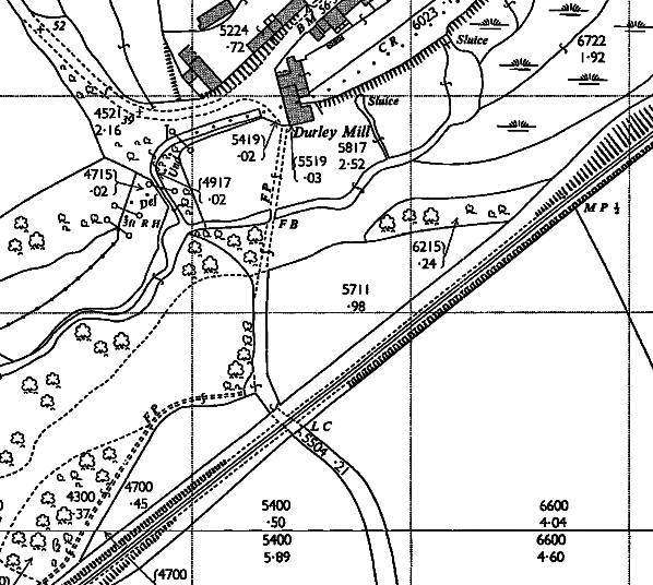 Today the old cart road is closed to all traffic between Blind Lane and Durley Mill and it has been downgraded to a public footpath and bridleway with two wooden bridges replacing the ford over the River Hamble. Durley Mill is now a private residence; the eighteenth and nineteenth century building ceased milling on 3 April 1965 and was sold the following year. It was Grade II listed by English Heritage on 6 March 1967 and still retains its 1875 waterwheel and some other machinery. Two girder bridges taking the railway over minor roads (Calcott Hill and Wangfield Lane) either side of the halt are extant.