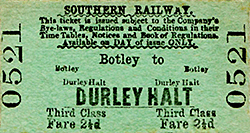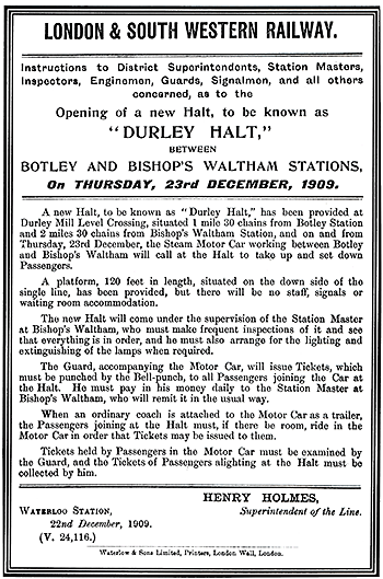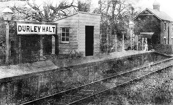 There was no demand for a station to serve Durley until the arrival of rail-motors on the branch in November 1904. A local campaign for the provision of a rail-motor halt at the crossing was led by the Sciver family who ran Durley Mill. The cost of providing a halt was estimated at £44 and this petition was considered by the L&SWR on 16 August 1905, but at that time it was rejected. A further attempt to persuade the L&SWR to provide a halt at an estimated cost of £67 was made on 4 November 1909. This time the petition was successful and was approved by the L&SWR board.