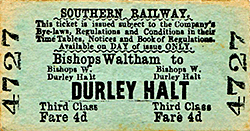 The Hants Chronicle reported that the halt opened on 23 December 1909 although it was not inspected by the Board of Trade until 24 January 1910. In his report, Major John Pringle RE stated: ‘I made an inspection today of the new works at Durley between Botley and Bishops Waltham on the London and South Western Railway. A new platform has been constructed on the north side of the single line about 2¼ miles south-west of Bishop's Waltham. The platform has a length of 120 feet, a width of about 8 feet and is raised 3 feet above rail level. It is properly fenced and lighted, and access is provided from the adjoining public road level crossing by means of a ramp. Nameboards ‘Durley Halt’ have been fixed. There is no shelter and no signals have been provided.’ He approved the opening of the halt for public use on the proviso that ‘further accommodation would be provided if such should be found necessary’. It is assumed that he was referring to the provision of a shelter. As passenger numbers came up to expectations in its first year approval for a timber open-fronted shelter on a concrete base at a cost of £35 was given on 3 November 1910.
