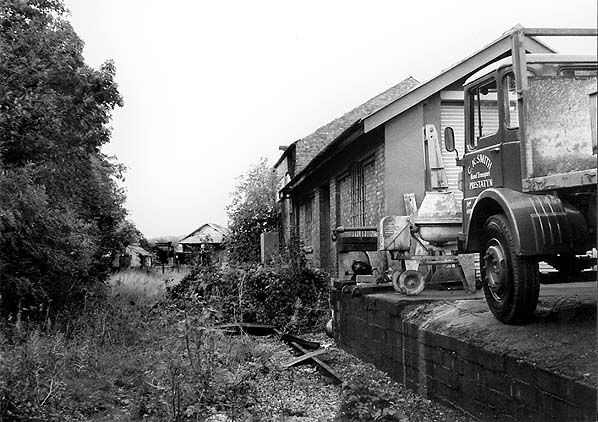 ![]() Station Name: DYSERTH [Source: Paul Wright] ![]() Dyserth station looking north from the buffer stops in October 1979. All of the original features of the station still survived at this time. In the middle distance to the left can be seen the passenger station's booking office with the 1869 goods shed beyond. Track was still in situ at this time but heavily overgrown. A regular service of stone trains had ceased in 1973.