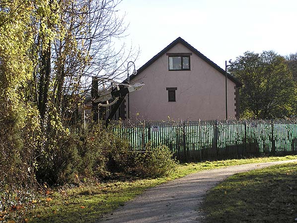 ![]() Station Name: DYSERTH [Source: Paul Wright] ![]() The end of the railway path in November 2010. The crane has been relocated here and now forms a feature. The path has been diverted to the right along the former quarry siding to end at the road. The station was straight ahead beyond the new housing.