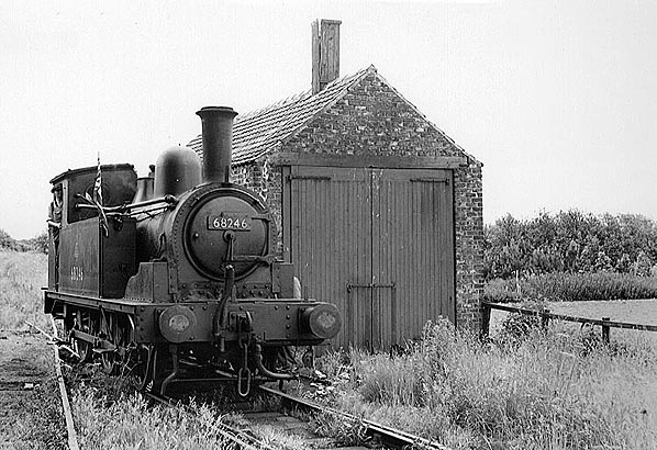 Easingwold engine shed in June 1957, the locomotove was hired from BR at this time and was too tall to use the engine shed.