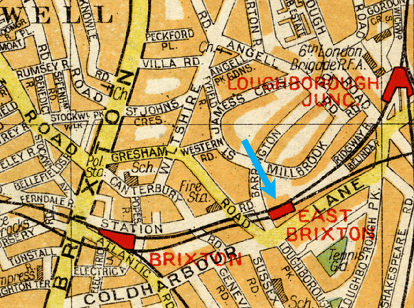 Notes: East Brixton railway station was a railway station in Brixton, south London. It was opened as Loughborough Park by the London, Brighton & South Coast Railway in 1866. Regular passenger service was the South London line from London Victoria to London Bridge terminal stations in central London. Initially provided with a steam passenger service, competition from electric trams caused a conversion to overhead line electric operation in 1909. The station became part of the Southern Railway in 1923 and overhead line electrification was swapped for third rail in 1928. The station lost patronage after the opening of Brixton Underground station in 1971. There was a fire at the station in 1975 and it was closed by British Rail in January 1976. The station was located next to the rail bridge over Barrington Road, near Coldharbour Lane. Since 2012 London Overground trains pass through the site of the former station without stopping and there has been some campaigning to reopen it.