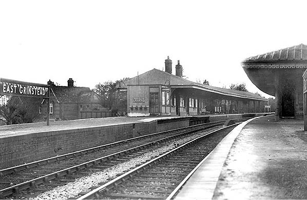 East Grinstead station looking west from platform 5 circa late 1950s. The station entrance building is seen on the left behind the running in board. This was the entrance for all platforms, East Grinstead being classed as one station with low and high level platforms.