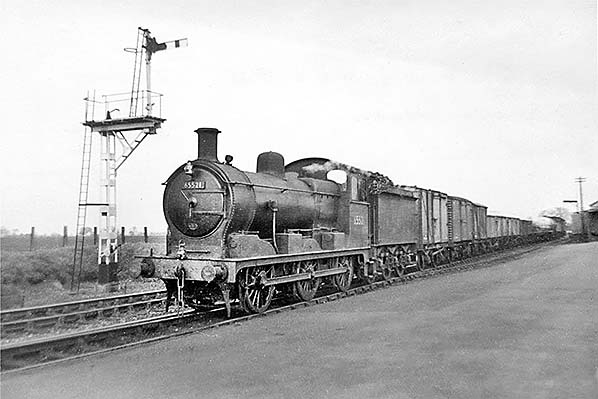 Photo from John Mann collection ![]() In April 1958 ex-GER Class J17 0-6-0 No.65521 waits in goods siding at East Winch. This locomotive had, along with other class members, spent some time at South Lynn shed but by the time she was photographed she was shedded at King's Lynn. She was steam-braked only and carries the Class 8 headcode. Apart from on the footplate, no staff are evident and no shunting appears to be ongoing so it is possible the train, too long for the loop, has been refuged to allow a passenger train to clear the running line. New in 1901 as GER No.1171, BR No.65521 was to survive until February 1962. One class member, No.65567 has survived into preservation and this machine is thought to have worked the final steam-hauled passenger train on the King's Lynn - Dereham line when she worked the RCTS Great Eastern Commemorative Steam Tour on 31 March 1962.