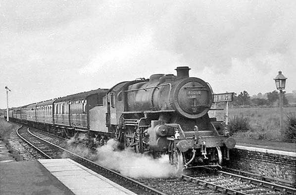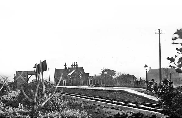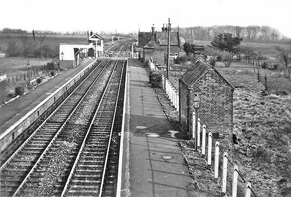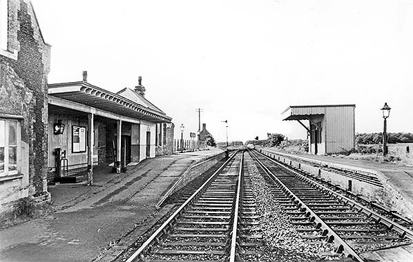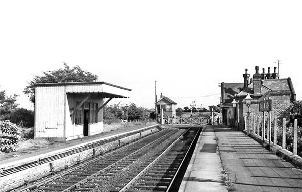 ![]() East Winch station looking north-west from the level crossing looking towards King’s Lynn in 1955. Lower quadrant signals were still in use at the time.