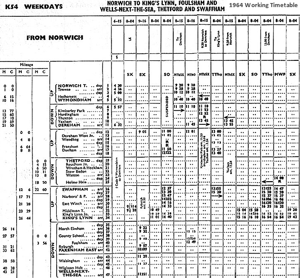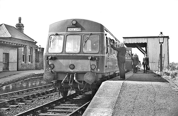 A two-car Metropolitan Cammell DMU called at East Winch to exchange single line tokens on its way from King’s Lynn to Norwich in this undated photo. Steam locomotives ceased running on passenger trains in September 1955 and the line closed in the same month in 1968.