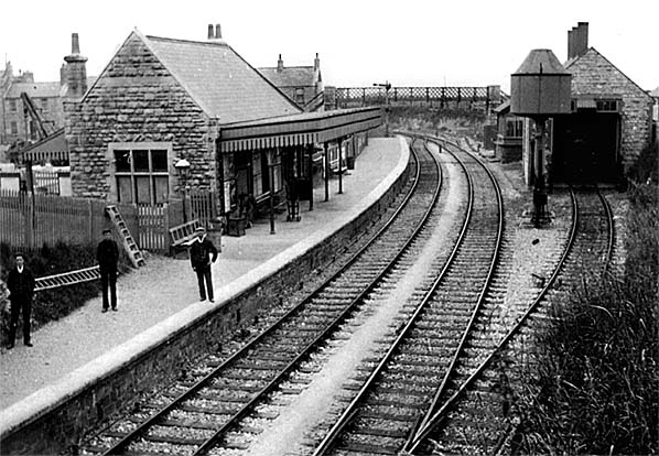 ![]() Station Name: EASTON![]() Easton station looking south from Reforne Street bridge c1920s. Note the verandah at the front of the station building providing weather protection for passengers arriving by cab. The 10-ton capacity crane can just be made out standing on the dock in the goods yard. A number of ladders seen on the platform suggest that the station is being repainted.