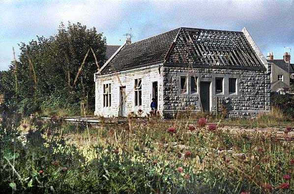 ![]() Station Name: EASTON![]() After closure to passengers in 1952 the canopy over the platform was quickly removed. The station site was bought by Portland Urban District Council in May 1972 and the site was cleared in December that year. This view shows the station building and platform in 1970. The building has been gutted and all the roof slates were removed earlier in the year.