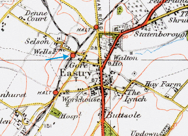 Notes: Eastry was the junction with the Richborough Port branch and was sometimes known as Eastry Junction. In c.1937 work was started on a triangular junction that would have allowed traffic from Wingham to run through to Richborough. The land was purchased and fenced, but no track was laid and the scheme was later abandoned.