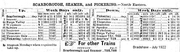 Intermediate stations were built at Forge Valley (serving East and West Ayton), Wykeham, Sawdon, Snainton, Ebberston (Wilton until 1903) and Thornton Dale. Trains ran between Pickering and Scarborough, also calling at Seamer which had opened with former York and North Midland route to Scarborough in 1845. The line retained the earlier name of the The Forge Valley Line, it was single track throughout with a passing place at Snainton, the only station with two platforms running for 1614 miles from Seamer Junction to Mill Lane Junction south of Pickering where it joined the NER's lines from Rillington and Bishophouse Junction on the York - Darlington main line .Services were four weekday trains each way; there was never a Sunday service and few excursions except for some to and from Helmsley. In 1928 the line became the first in the area with a regular Sentinel steam railcar service for passengers introduced by the LNER in an attempt to keep costs down. Railcars were considered suitable for this line as passenger traffic was light and there were no steep gradients. The Sentinels were mechanically unreliable and struggled to cope with attachments such as horseboxes, commonly required on rural lines. All the stations except Wykeham had facilities to deal with livestock, and such agricultural produce comprised most of the freight on the line, although there was also stone from a quarry at Thornton Dale.