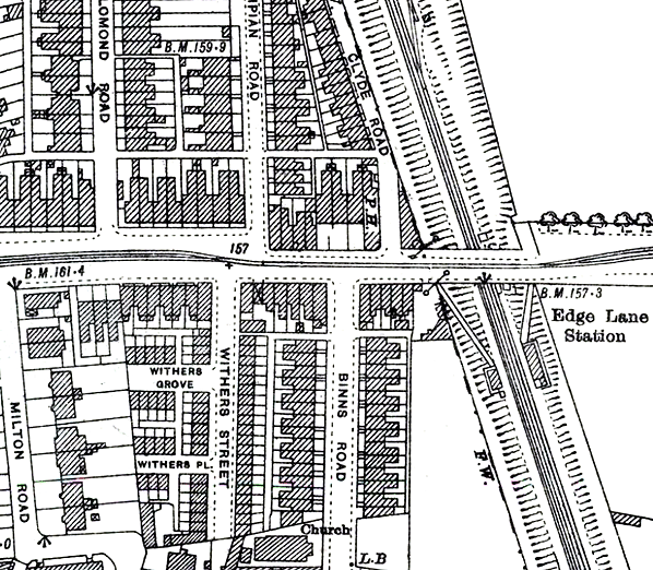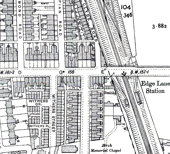There were no goods facilities at Edge Lane station; they were located at Stanley station which was only 32 chains to the north.