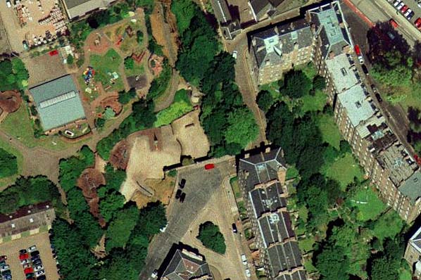 The site of Edinburgh Scotland Street Station today. The red car in the centre of the picture is on to of the north portal of Scotland Street tunnel. The station was in the