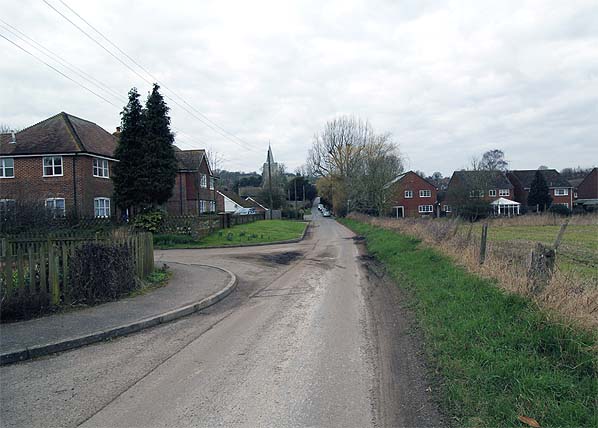 The site of Elham station level crossing in March 2012. The station was on the site of the road which branches to the left