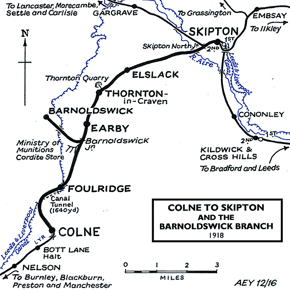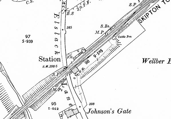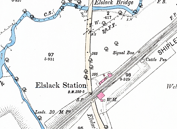 ![]() 1909 1: 2,500 OS map. An interesting change since 1894 is that two signal boxes are now shown side by side at Elslack station: presumably the larger one has replaced the smaller one. There is still no down platform on the map although a small structure has appeared on the down side of the line beside the bridge. This is possibly the timber building seen on the 1952 photograph.