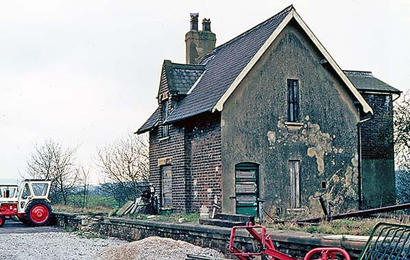 Photo from John Mann collection ![]() Elslack ticket office on the last day of public service in 1952. Junior porter Tony Millington sells the last ticket from Elslack to Skipton to reporter I I Illingworth. Photo from Debbie Green (Tony Millington was her dad) ![]() The up platform of the disused Elslack station looking west in April 1976. The stationmaster’s house stands derelict, its windows and doorway boarded up, and part of the platform has collapsed. Nothing remains of the station building which formerly stood to the left of the house. The tracks through the station were removed soon after the line closed in 1970, and agricultural equipment is occupying the trackbed. At this date nothing remains of the timber down platform which was staggered south-west of the up platform.