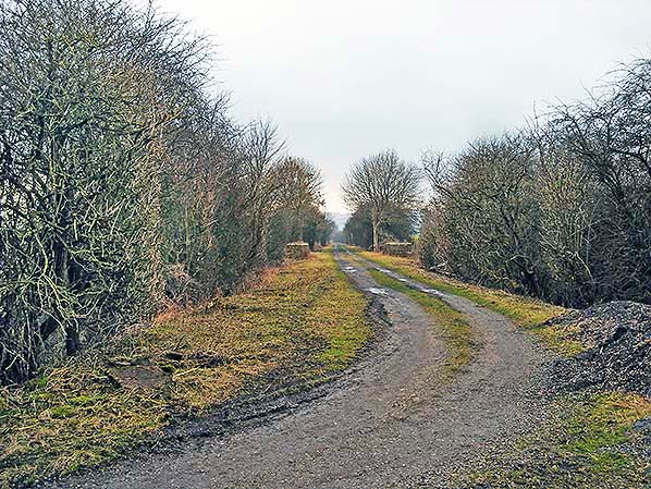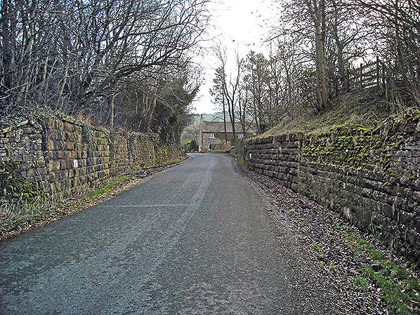 ![]() Looking south-east along Elslack Lane in February 2017. The abutments of the Colne Branch railway bridge are ahead. The down (Colne-bound) platform was located several yards to the right of the fence seen on the truncated railway embankment.