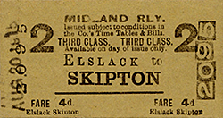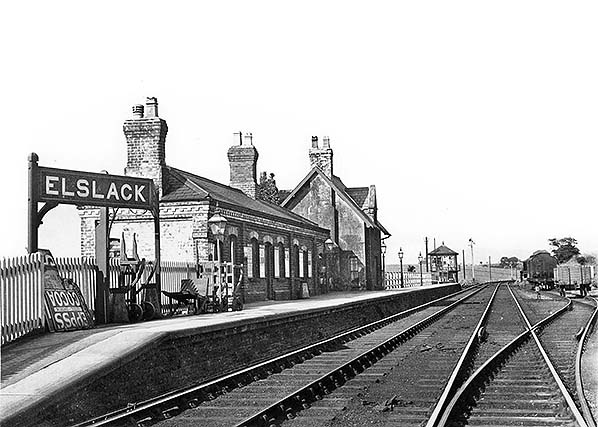 ![]() The up platform at Elslack station looking north-east c1905. The platform arrangement is staggered with the down platform behind the photographer on the far side of the bridge over Elslack Lane. The single-storey brick building with the hipped roof contains the booking office and waiting rooms. Window and door and window openings have segmental arches and dentillation of the cornices provides some decoration. Beyond is the two-storey stationmaster’s house, brick-built with an overhanging steeply pitched, slate roof, broken by a gabled dormer. The signal box is several yards north-east of the platform ramp. The running-in board illustrates Midland Railway practice of providing two adjoining boards set at angles to enable the station name to be read easily from both up and down directions. Oil lighting is provided in casement lamps fixed to the building and on posts. Milk churns, empty barrows and an unceremoniously inverted advertising sign provide interest in the foreground. The goods depot is seen to the right, but the camera angle misses the goods warehouse.