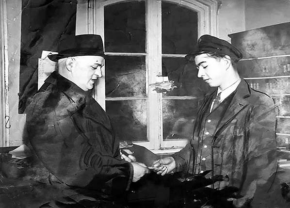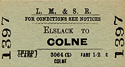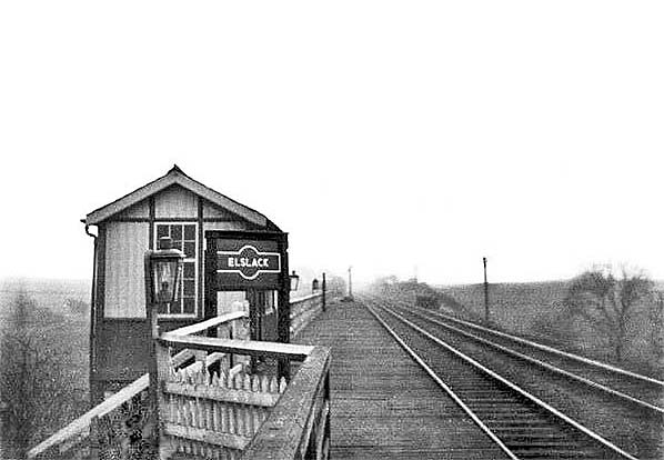 ![]() The down platform at Elslack station is seen in 1952, the year of its closure, looking south-west. It is of timber construction perhaps because it is on an embankment where a masonry structure could have been too heavy. The enclosed waiting room in a small timber building supported on struts. An LMS ‘Hawkseye’ running-in nameboard is installed at an angle enabling it to be more easily read from entering trains (by passengers facing forwards). It is possibly mounted on two of the three posts that the Midland Railway would have installed for its distinctive nameboards, as seen on the older view of the up platform. The casement oil lanterns are of a cruder style than seen on the up platform. The different style of lamps suggests that this platform was built at a different time from the up platform.