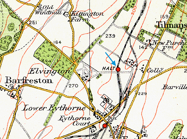 Notes: Before opening the halt was to be called Elmton after a local farm but it opened as Tilmanstone Colliery and was provided to serve Elvington Court a large country mansion that had been converted into a hostel for 120 miners. Later an estate of house was built for the workers who largely came from mines in other parts of the country. The halt was renamed Tilmanstone in the1925 Bradshaw and from 1927 it appeared as Elvington. There was no road access to the halt which was sited adjacent to a footpath running from Pike Road, through Tilmanstone Colliery to the miners housing estate at Elvington.