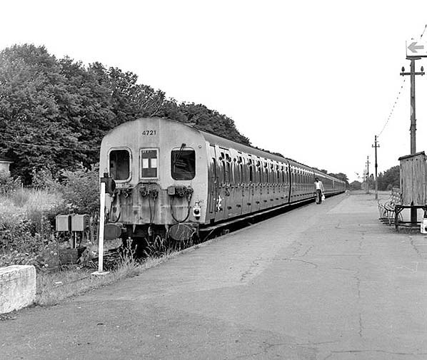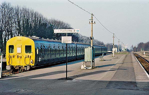 Photo by Alan Young ![]() By 1975 only one island platform remained in use, the track into the other platforms having been lifted. Although the station retained much of its BR Southern Region green signage, the two remaining platforms, 4 and 5 and been renumbered 1 & 2 with a new BR Corporate Identity sign .On 24 February 1975 slam-door Eastleigh-built Class 405 4-SUB EMU 4740 is providing the service on this day.