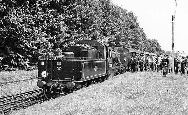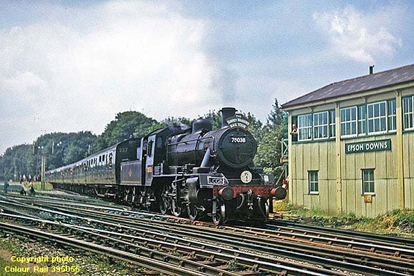 Photo by D. Clayton ![]() On 5 July 1964 the Locomotive Club of Great Britain's 'The Surrey Wanderer Rail Tour' departs the weedy platforms at Epsom Downs, passing the station's large and somewhat makeshift-looking signal box. The locomotive is BR Standard Class 2 2-6-0 No. 78038. A Riddles development of the LMS Ivatt 2MT, the Standard Class 2 was a rare visitor to the Southern Region. No. 78038 was a Willesden locomotive at the time and the reason for its choice on this railtour is unknown. Withdrawn in 1966, she was not among the handful of the class to survive into preservation. Interestingly, parts of this tour also used Drummond M7 0-4-4T No. 30053 which had, at least on paper, been withdrawn a couple of months previously. This locomotive subsequently spent some twenty years at a museum in the USA; since repatriated she is now at the Swanage Railway. Coaching stock set No. 237 is seen here shortened to six car formation; ordinarily it was a 9-set (nine car) allocated to Waterloo - Swanage services and in 1964 comprised mostly BR Mk I stock but the vehicle nearest the camera is of Bulleid origin. In an earlier guise when formed of Maunsell stock, set 237 was one of two used, rather oddly perhaps, for an experiment with a chocolate and cream livery which was rejected by the Southern but later adopted, appropriately, by the Western Region. Beginning at Waterloo and ending at Victoria 'The Surrey Wanderer' really did wander