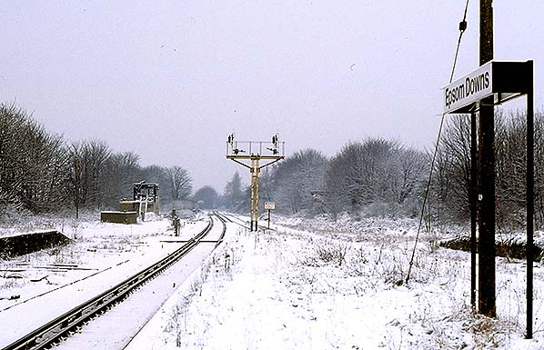![]() A bleak scene at Epsom Down station looking north-east in December 1981. The burnt-out shell of the signal box which was destroyed in a fire a few weeks earlier is seen in the distance on the left. The semaphores have been removed from the signal post. Photo by Alan Young ![]()