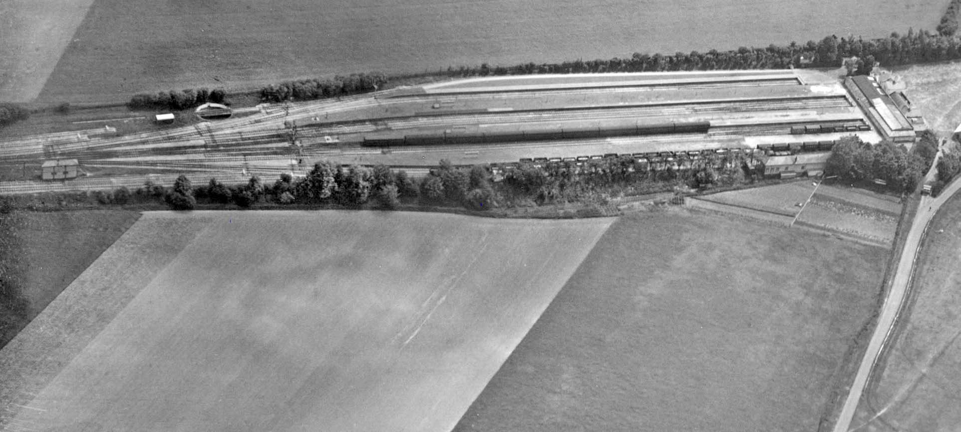 An aerial view of Epsom Downs station looking south-east in May 1922. Visible are the station buildings and all platforms, albeit with Nos.1 and 2 partly obscured by trees. It would appear that the west side platforms doubled as goods faculties and apart from on race days probably served this purpose for much of their active life. The single-storey building alongside platform 1 was probably offices and, if the gardens behind it are anything to go by, staff accommodation. The reason for the large circulating area at the head of platforms 8 and 9 is unclear but was probably for the benefit of royalty and entourage as the Royal Train seems to have usually used these platforms. It is likely that road vehicles waited here to transport the regal arrivals onward to the racecourse. Towards top left can be seen the locomotive turntable with, to its left, what appears to be a grounded van body in use as a hut. Not at all clear in this view is that south of the turntable, i.e. to its left, the turntable road split into two sidings but of unequal length with the shorter being furthest from the camera. At the end of the longer siding once stood a water tower (out of view in this picture) but little is known about it. The signal box, centre left, dated from 1879. It contained a 72-lever frame of the Saxby & Farmer spindle-locking type which had served at London Bridge from 1866 until 1878. Despite being modified to tappet-locking in 1908, it became the last in-use surviving frame of its type and remained in operation until the box was destroyed by fire on 16 November 1981. At some point in Southern Railway days the box was given an additional 2-lever frame to operate detonator-placing equipment.