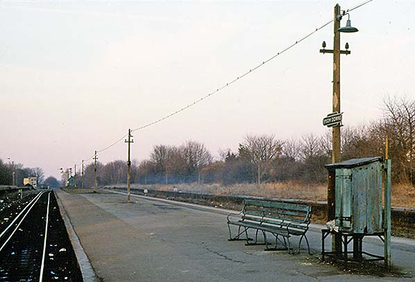 ![]() Epsom Downs station looking north-east along platform 1 in February 1979. The concrete lampposts are probably of Southern Railway origin. The light fittings are of an unusual style for the Southern Railway/Region. Many BR(SR) totem nameplates are still displayed on the station. Photo by Alan Young ![]()