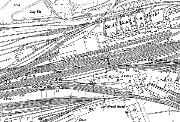 Notes: Map evidence (1895) seems to confirm that Eston station was re-sited about 150yd east of the original Eston (or Eston Junction) following the acceptance of tenders for a new station ‘near the junction’ (just east of where the Eston Mines branch left the Middlesbrough – Redcar route) on 16 November 1864. No opening date of the new station has been found, but it is assumed to have been c1866. The station was renamed Southbank (or South Bank) on 1 December 1877, but reverted to Eston on 1 May 1882 when a new South Bank station was opened about ¾-mile to the west. The two stations, South Bank and Eston, co-existed until 22 November 1885 when Eston (2nd) / South Bank (1st) closed. On the same date a new station, Eston Grange, was opened almost a mile to the north-east. This new station was renamed Grangetown on 1 January 1902 when the terminus of the Eston branch (which actually served the village) opened to passengers.