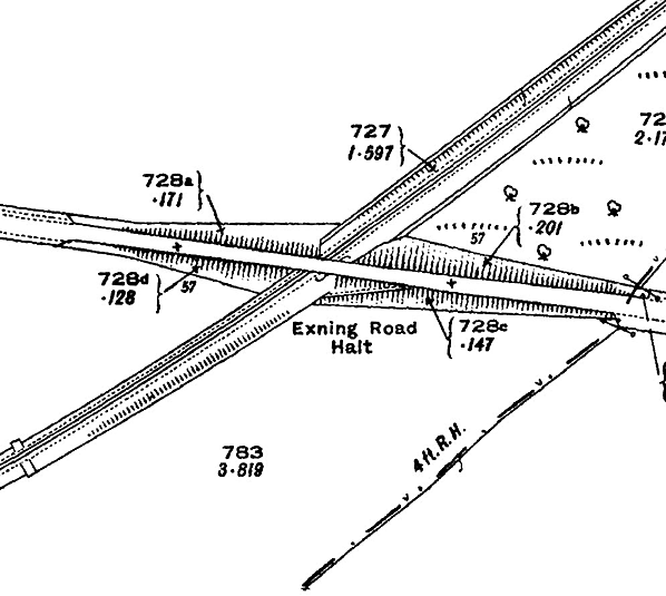 Copyright photo from Tony Harden collection ![]() ![]() Exning Road Halt on a 1927 1:2500 map. Burwell is to the west on both road and railway while the road to the east eventually comes to Exning and then Newmarket. Apart from nearby Burwell, the only other evidence of human life in the area of the halt was a couple of cottages and a farm along the road towards Exning. Like all the halts, Exning Road is sited on the up side of the road. No platform is indicated here but the steep path down from Newmarket road is seen.