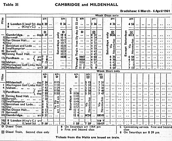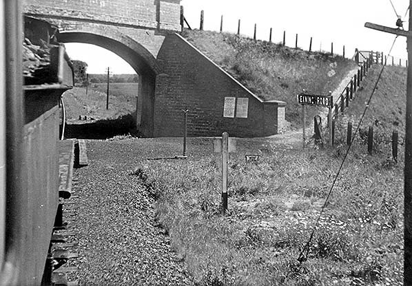 ![]() Exning Road Halt viewed from a Mildenhall-bound train on 5 October 1957. The elevated position affords a good view of the access path down the embankment. The nameboard is beginning to look just a tad shabby and two notice boards are in position on the bridge wing - not that there were ever many passengers to read them. An enlargement of this image suggests that the notice on the left gives timetable details among other information. To the right of the metal sign, which either warns against trespass or advises it readers to 'Beware of Trains', is what appears to be the oil lamp casement lying on the ground. Given the month and the service level at this time, the lamp would be out of use. The portable steps have yet to appear, but their arrival is imminent as Gresley brake thirds were due to be introduced and not all of these vehicles were fitted with retractable steps. The train is the 10.23am ex-Cambridge, the locomotive is tender-cab J15 No.65438 and the stock comprises a Gresley composite, from which the photograph is taken, and an ex-GER brake third. This same train was photographed on its return to Cambridge departing from Burwell. See the page covering that station.