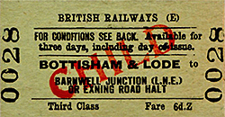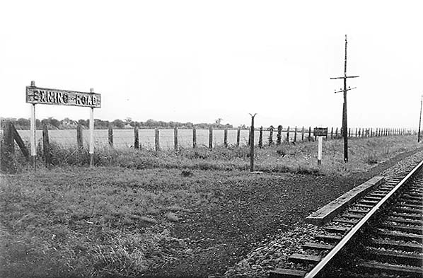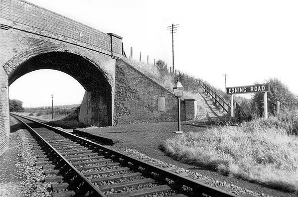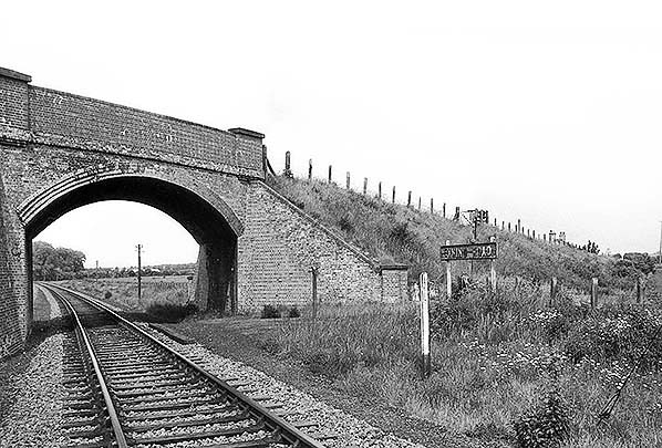 ![]() Looking towards Fordham we see Exning Road Halt on 16 June 1962, the final day of the passenger service. There is no sign of the portable steps or the oil lamp, although in June the lamp would not be required. The poster boards on the bridge wing have also vanished. As explained on the Fen Ditton Halt page, the suggestion that Tilley lamps replaced the wick lamps at the halts is open to question. Above the nameboard the gate at the top of the access path can be seen, while the path itself appears to be quite grassed over. This is not surprising given that the halt saw little use. In the right background another of the diamond-shaped road signs, as described on the Burwell page, can be seen. Also on the right the chimneystacks of the nearby cottages are visible above the road. Burwell was within walking distance to the left but the cottages and a farm were the only habitations near the halt. On the extreme left the cast iron plate bearing the bridge number, 2242, is seen.