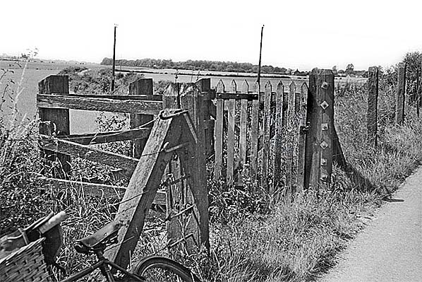 Copyright photo from Tony Harden collection ![]() A close-up view of the site of the halt in July 1969 looking towards Burwell. Obviously summer, the undergrowth is flourishing and the sleeper 'platform' facing is only just visible towards the bottom right of the image. Photo by John Mann ![]() A July 1969 close-up view of the gate at the top of the embankment assault course. When comparing this view to that showing the Ford Anglia, the gate appears to have gained a further degree of dilapidation. Note the period bicycle with its comfortable coil-spring saddle, proper rear mudguard, plastic handlebar grips and obligatory wicker basket. One suspects the bicycle conveyed the photographer to the location. The sturdy fencing around the gate was necessary not just for public boundary purposes but also to prevent people from falling down the side of the embankment. Fencing continued down one side of the footpath to track level for the same reasons. On the left, the trackbed can be seen curving towards Burwell station, out of sight beyond the belt of trees, while on the right and in the distance some houses at the south-east corner of Burwell village can just be seen - probably on Isaacson Road which then had only a scattering of houses. Since the railway closed a further, small, estate has been built between Isaacson Road and the site of the halt, which now lies only a quarter of a mile from the edge of Burwell village.