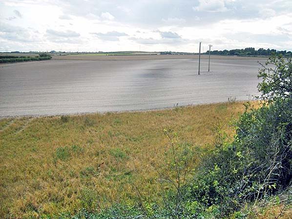 Photo by David Burrows from his Flickr photostream ![]() An August 2008 view from the top of the infilled bridge and looking towards Cambridge. Burwell station was behind the trees in the right background. The dark patch, or cropmark, curving away across the field marks the course of the railway which was in a shallow cutting. Exning Road Halt was in the grassed area towards the left of the image. Border Bridge was infilled c2000 as its condition had become a cause for concern and crash barriers now mark the site of its parapets. The overhead power lines are visible in other images but the pole which once stood on the up side of the railway has vanished. Contrary to popular belief, this area is not in the Fens which lie to the north. The ground here is on chalk while a mile or so to the east is the start of the heathlands for which the Newmarket area is well known.