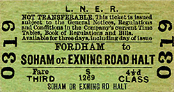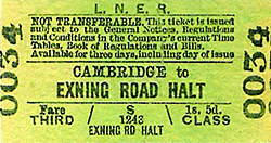![]() This is one of a number of photographs of Exning Road Halt which exist but which are unfortunately undated. This appears to be a fairly early view, perhaps 1930s, as everything is neat and tidy. The nameboard is in good order and in later years it had become very shabby. There is one notice board on the bridge wing; later there were two. The photographer is standing in Cambridgeshire and immediately beyond the bridge is Suffolk. Quite why the GER did not provide simple wooden platforms of a proper height, instead of tolerating the ongoing expense of converting rolling stock to suit the halts, is something of a mystery. Remember that from 1922 the 6-wheel conductor-guard stock conversions were quite drastic and by no means involved only the provision of retractable steps. Over a period of 18 years some 40 of the 6-wheelers were converted - hardly a cheap solution and at a time when the GER was very economy-minded.