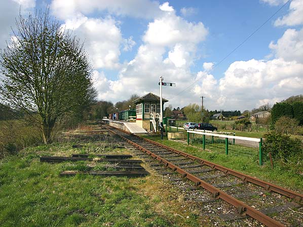 ![]() Looking west towards Eythorne Station in April 2008. The station lies partially on the site of the original station although although not on the site of the later shortened platform which was where the fence is to the right of the track.
