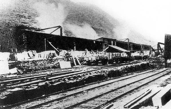 Gallery 4 additional photos of Facit Station and quarry ![]() The incline up to Facit Quarries was connected to the stone processing works sidings a short distance north-west of Facit station. Rope haulage was used on the incline, and the incline engine house chimneystack is visible at the summit. In this view a wagon is descending while the balancing empty vehicle is just visible at the top of the slope. To avoid the risk of a serious accident should one of the wagons career down the incline a ‘zig-zag’ was installed at the foot of the slope; wagons descended to the left, then passed to the right, and then needed to travel to the left again to enter the LYR goods yard. There is no record of any mishaps on the incline. This view, looking north-west is undated. The incline was lifted in 1947.